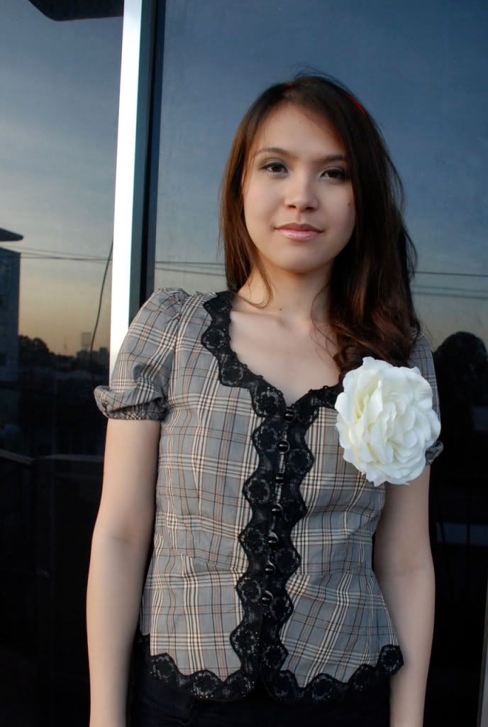 fun little plaid top with puffed sleeves and romantic lace trims.